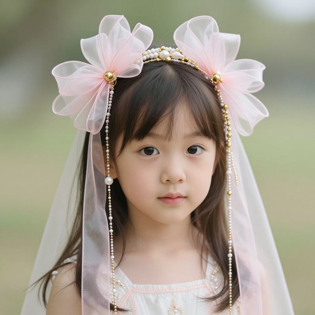Radiant innocence meets whimsical wonder as a child dons a headpiece crafted from ethereal pink ribbons adorned with golden beads, evoking a dreamlike fusion of fashion and fantasy.