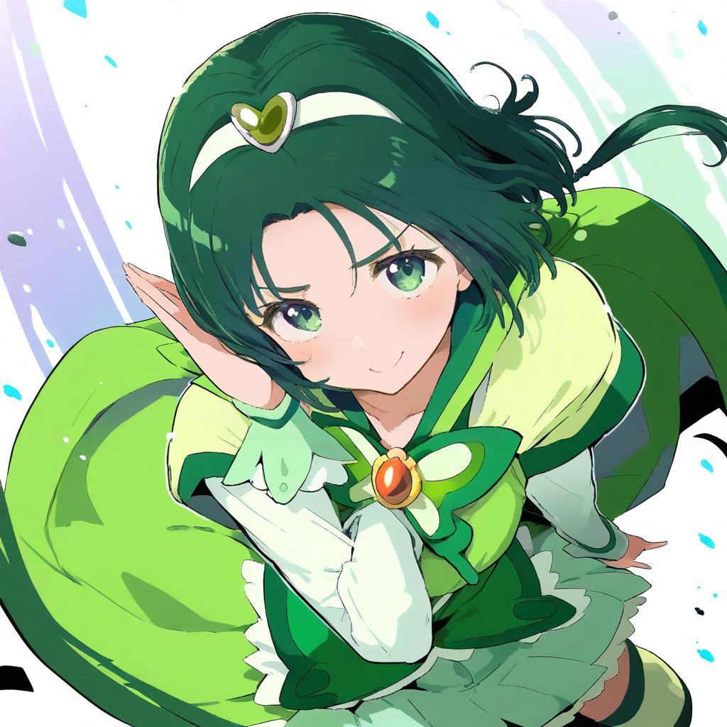 Akimoto komachi, precure, 1girl, green eyes, green hair, long hair, magical girl, magical girl, butterfly brooch, by artist puuakachan, animagine