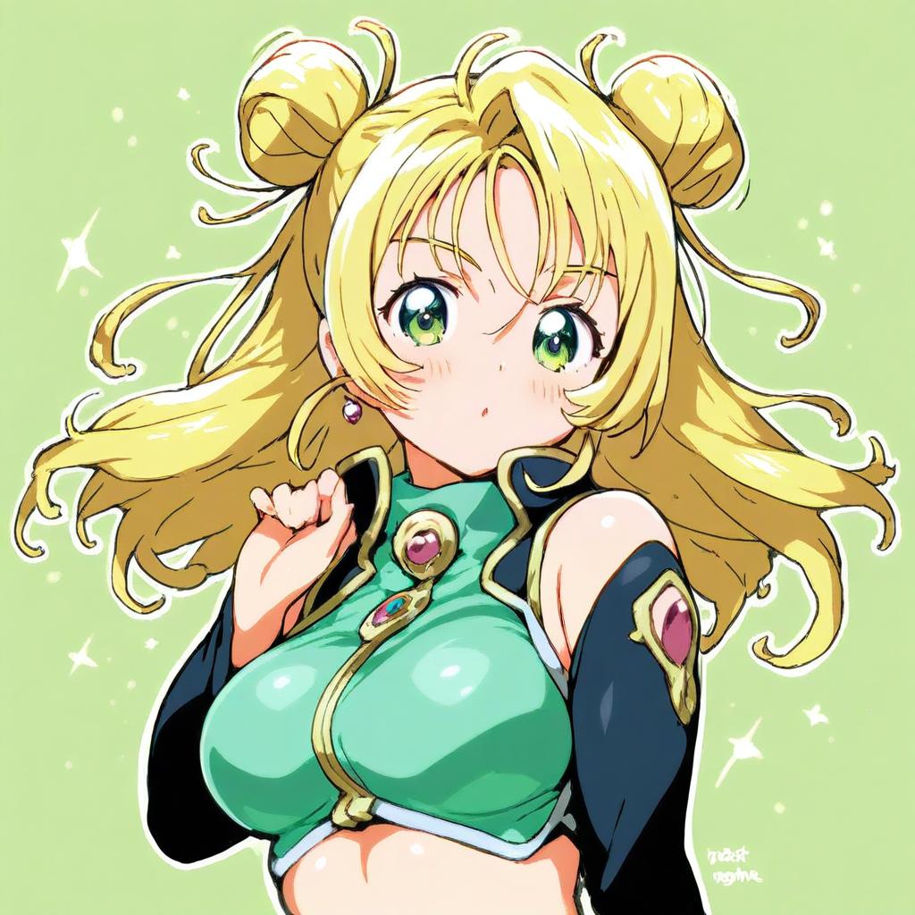 Digital illustration of a magical girl character with long green hair and green eyes. She wears a vibrant green and white outfit adorned with a distinctive butterfly-shaped brooch with an orange gem. The character poses confidently with a hand near her face, set against a soft pastel background featuring gentle blue and purple hues.