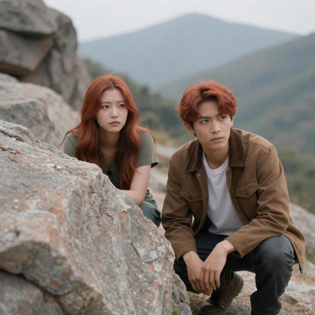 Photograph of a young Asian man and woman with reddish hair crouching behind large rocks in a mountainous outdoor setting. The woman on the left wears a green top and has a serious expression. The man on the right wears a brown jacket over a white shirt and dark pants, looking forward with an intense gaze. Rocky terrain and distant mountains form the background under an overcast sky.