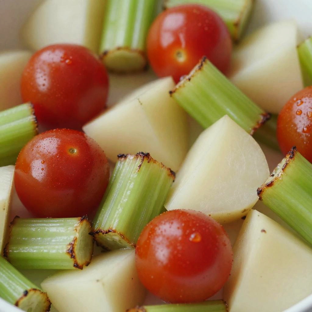 This is a close-up photo of a colorful, mixed vegetable dish. The image features chunks of bright red cherry tomatoes, green and brown-edged celery pieces, and white potato bits. The textures are varied, with the tomatoes appearing glossy and the celery showing a charred, crispy exterior. The colors are vibrant, with red, green, and white standing out prominently.