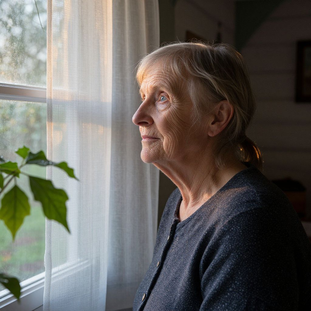Photograph of an elderly woman with short gray hair, wearing a black sweater, gazing out a sunlit window with soft curtains.