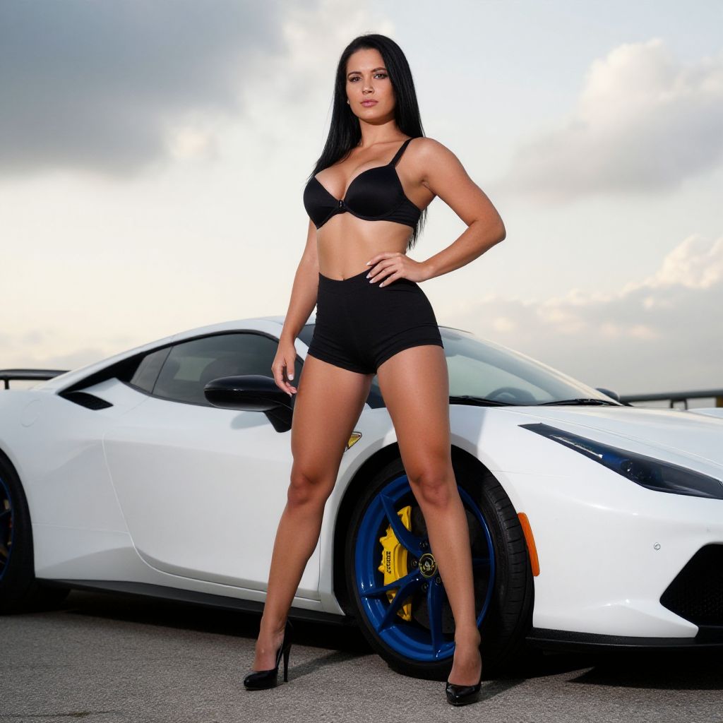 Photograph of a curvy woman with long black hair kneeling beside a shiny black Ford Mustang in an urban, sunlit parking lot. She's wearing a tight black dress and high heels, her right hand on the car's door. The background shows a cityscape with skyscrapers and a bridge. The car's sleek design and her confident pose make the scene dynamic.