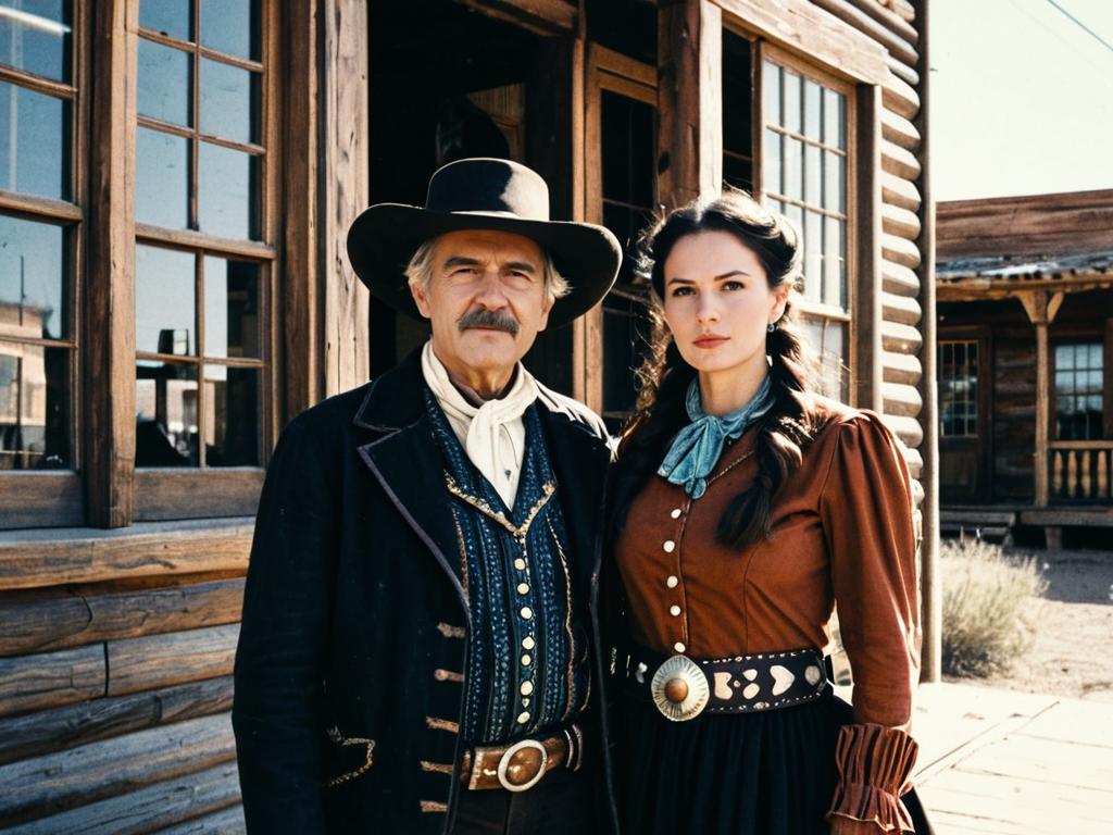 Old Western Female, woman in a western outfit holding a sign in front of a building