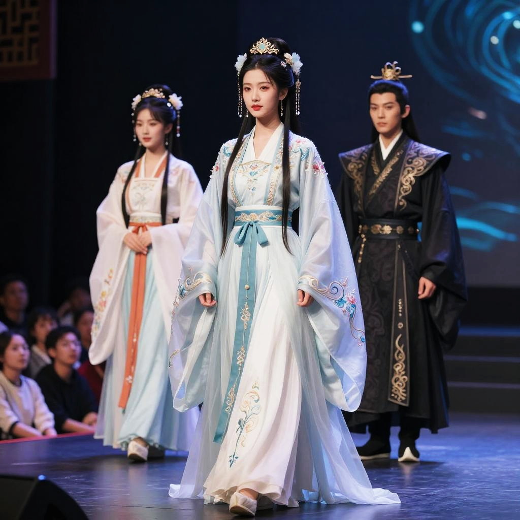Cosplay generator blending traditional cultural attire with modern fantasy elements, showcasing elegant fabrics, ornate embroidery, and mythical motifs, set on a stage with dramatic lighting and an audience captivated by the performance.