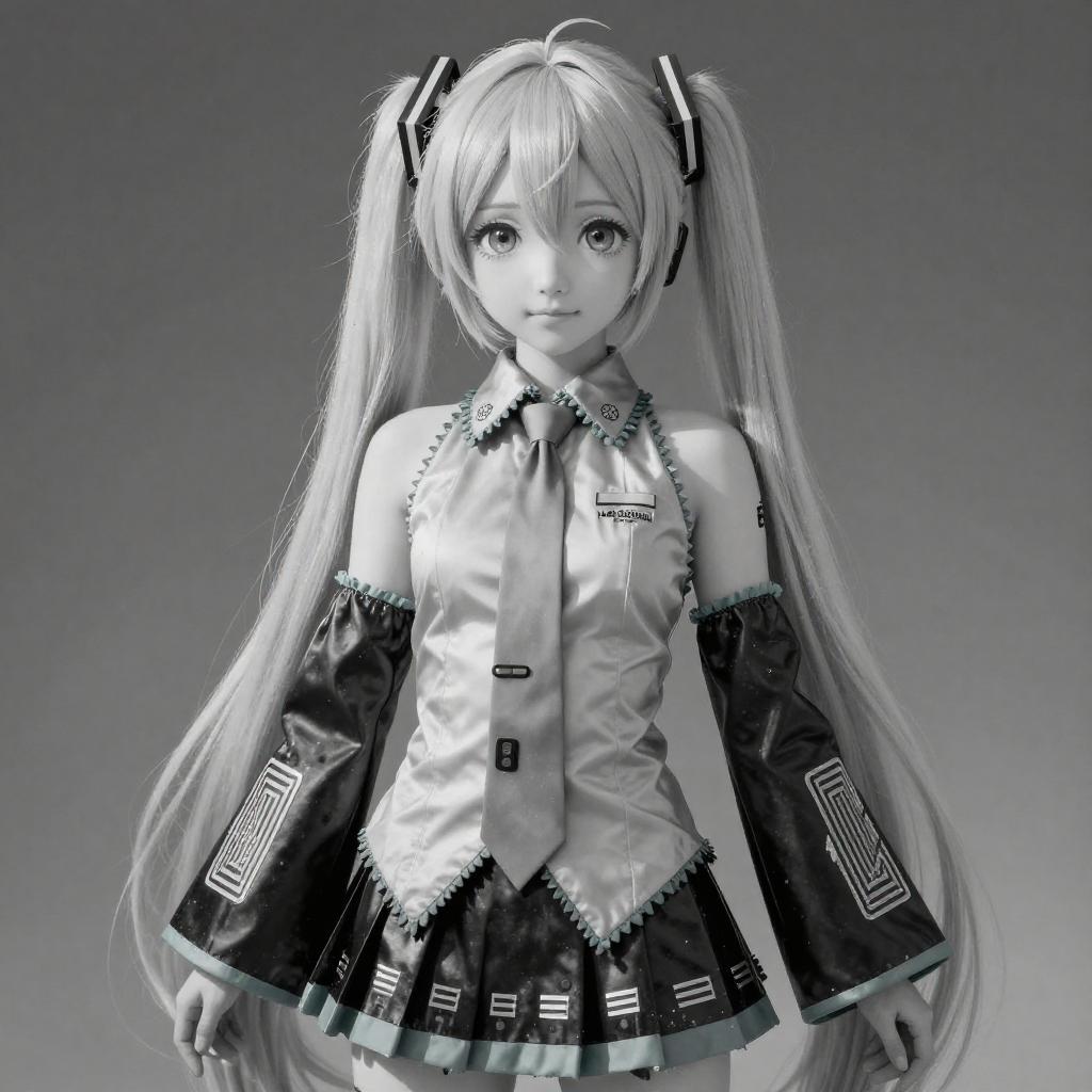 Black-and-white digital art of Hatsune Miku with long twin-tails, wearing a sleeveless shirt and pleated skirt, standing against a gradient