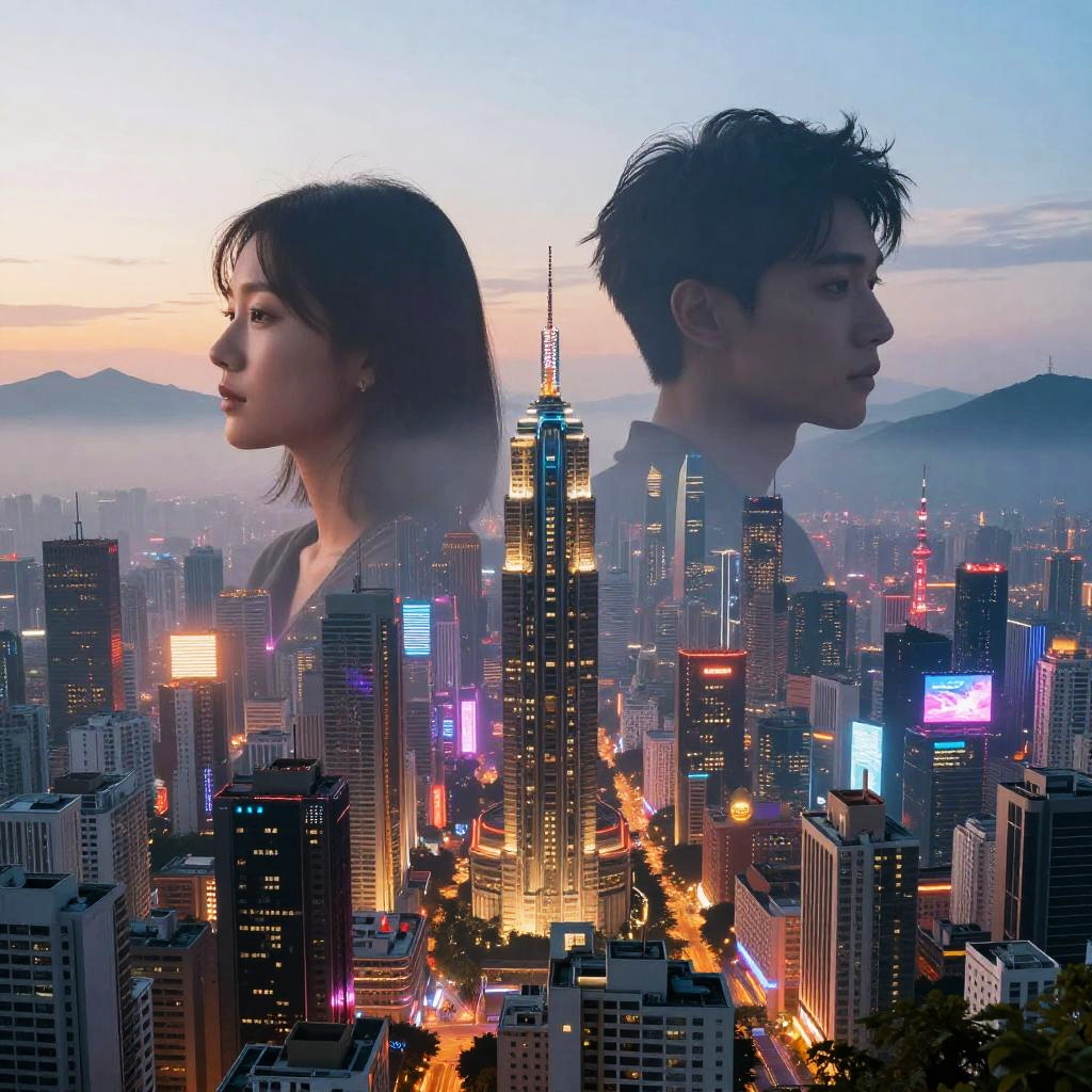 AI morph two images seamlessly, blending a serene mountain landscape with a bustling futuristic cityscape, vibrant colors, ultra-detailed, hyper-realistic, digital art, smooth transitions, glowing elements, cinematic lighting, high resolution.