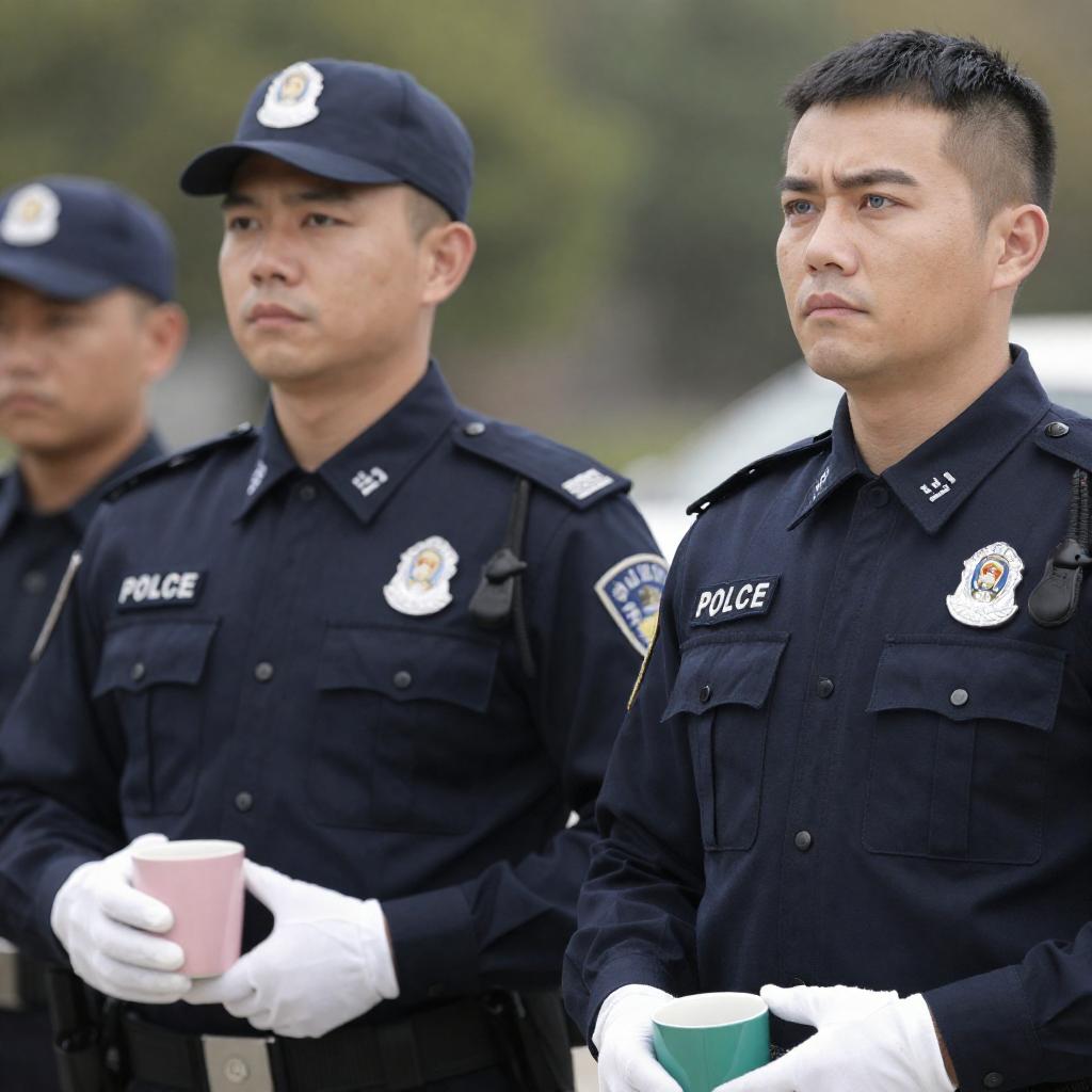 Photograph of two male police officers in dark uniforms, both with serious expressions. Officer on left holds pink mug, wears white gloves. Officer on right holds green and white object, has blue eyes. Background includes blurred greenery and another officer.