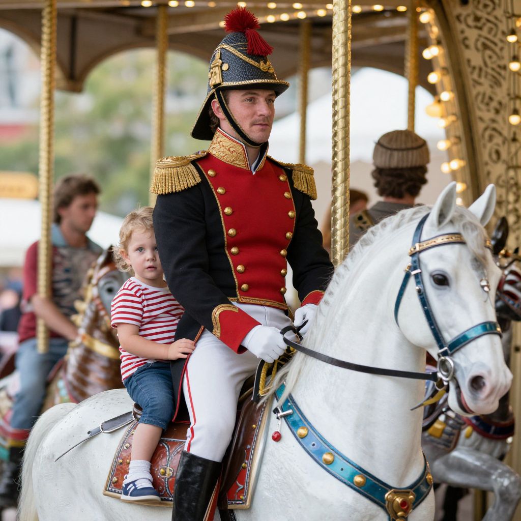 The image depicts a highly detailed and realistic scene of a man dressed in a elaborate, historical military uniform, sitting on a white horse adorned with ornate decorations. The man's uniform features gold buttons, epaulettes, and a red sash, suggesting a high rank or significant status. He is wearing a large, ornate hat with a red tassel, adding to the grandeur of his attire. To his left, a young child in a striped red and white shirt is seated, looking directly at the viewer with a curious expression. The background is filled with blurred figures, creating a sense of depth and movement, as if the scene is taking place on a carousel. The overall composition is dynamic, with the man and the child positioned in the foreground, while the blurred figures in the background add a sense of motion and liveliness to the scene. The sharp focus on the man and the child contrasts with the softer, out-of-focus background, drawing attention to their interaction and the intricate details of their attire and the horse's decorations.