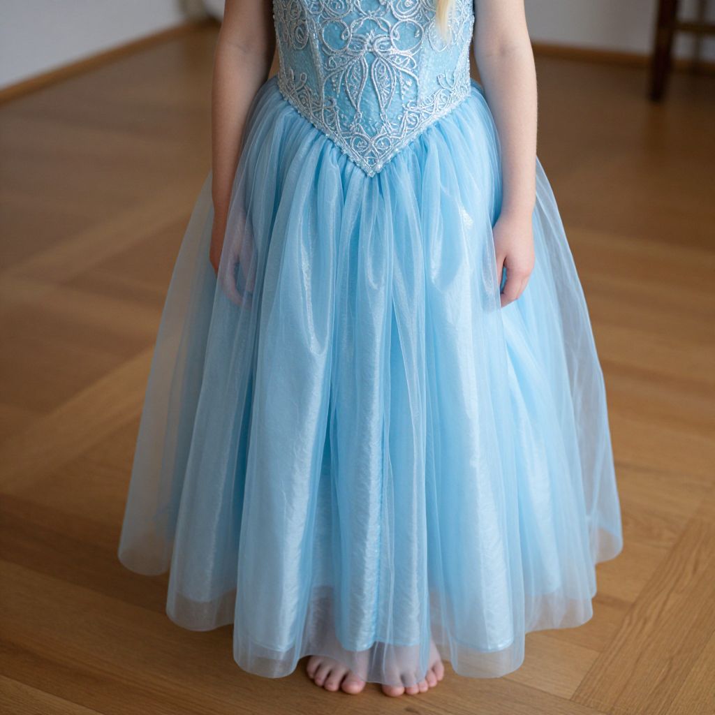 Photograph of a child in a light blue, lace-trimmed, tulle ball gown standing barefoot on wooden floor.