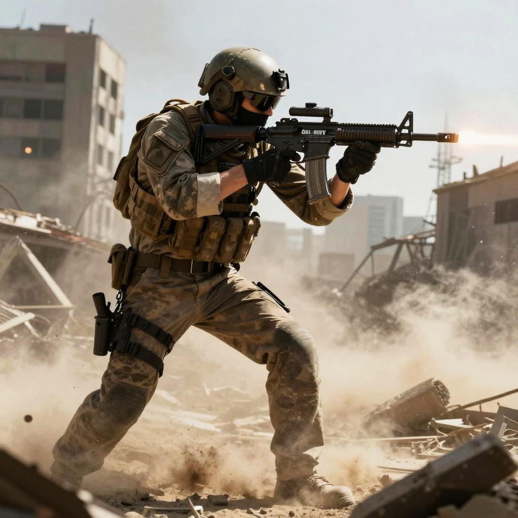 Action-packed photo of a determined urban riot policeman in full tactical gear firing a rocket launcher amidst a battlefield of shattered buildings and smoke, with a dramatic red sky in the background.