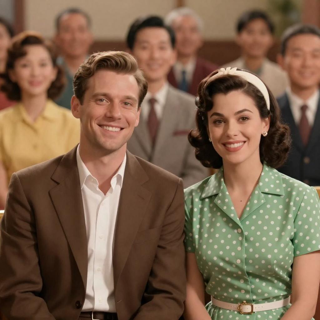 Photograph of a man and woman standing beside a yellow and red vintage airplane. The man, with short brown hair and a serious expression, wears a beige pilot uniform. The woman, with brown hair in a bun, smiles and wears a light blue shirt and pants. The background shows trees and a clear sky. A movie poster-style graphic is in the bottom right corner.