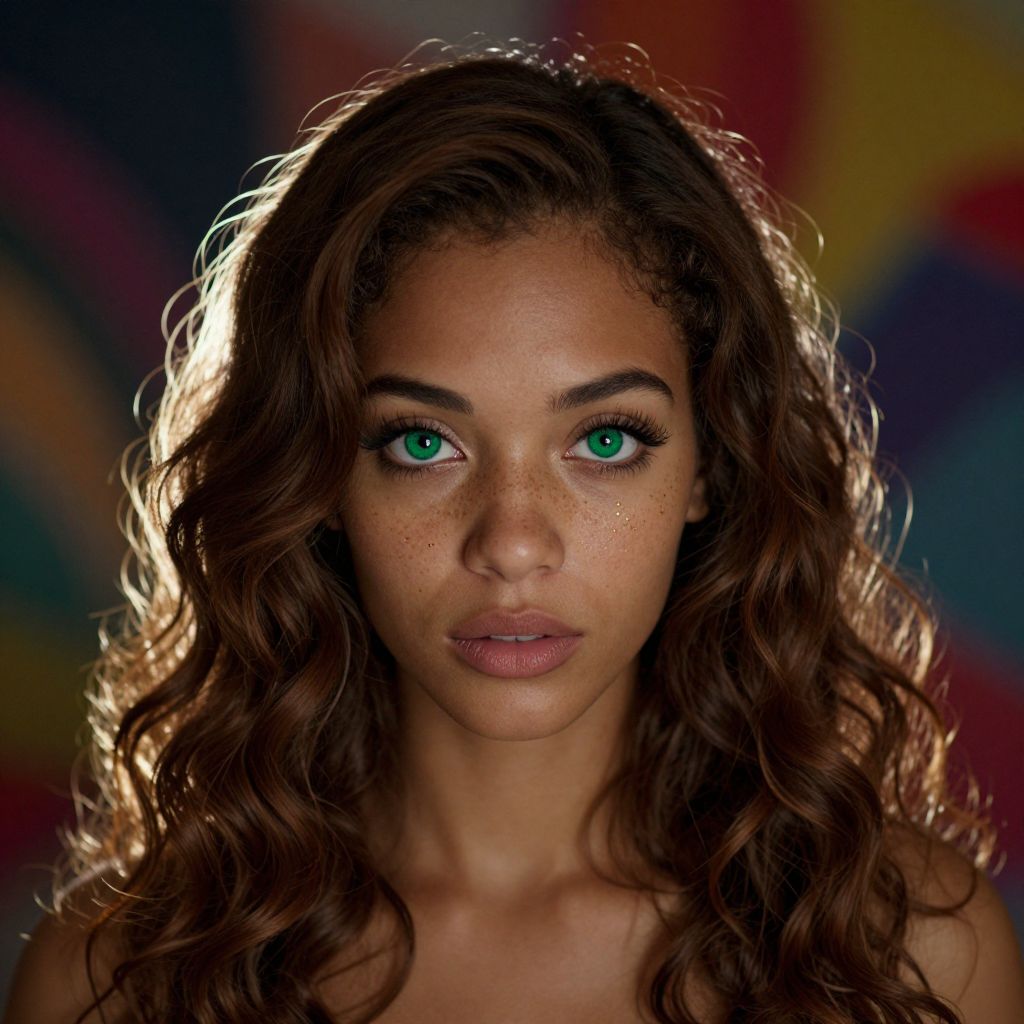 Imagine an ultrarealistic portrait of a young Caribbean woman with porcelain skin and rich, chestnut-brown hair flowing in soft waves over her shoulders. Her captivating emerald-green eyes, framed by long dark lashes, are adorned with golden freckles that scatter across the bridge of her nose. Lit from behind to create a dramatic backlight effect, she stands against an abstract background where vibrant colors blend together, blurring the line between reality and imagination. The scene is captured from a unique 'bird's-eye view' perspective, revealing intimate details of her delicate facial features and the gentle texture of her hair. This composition evokes a sense of vulnerability and introspection within the viewer.