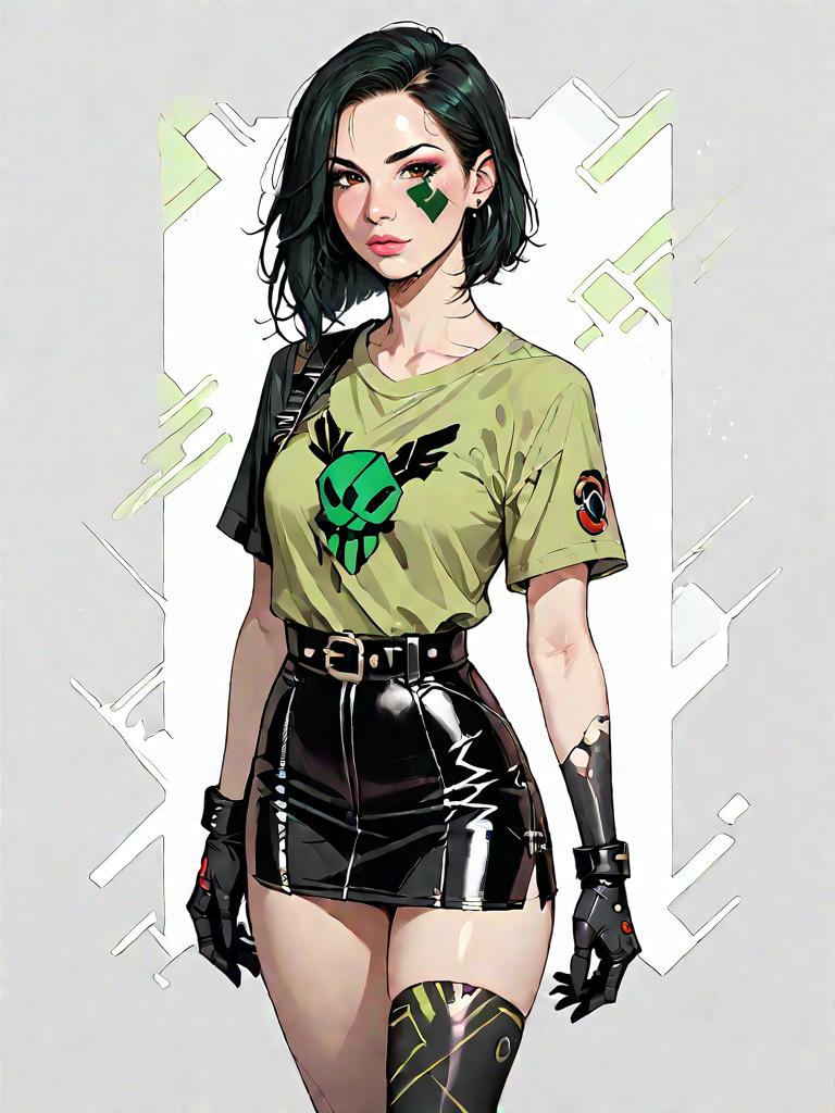 Digital illustration of an edgy woman with straight black hair, wearing an olive green fitted t-shirt with a green skull graphic and short sleeves. She has a black faux leather mini skirt featuring a diagonal textured pattern and asymmetrical hem, accessorized with a wide belt and black wrist gloves. The woman also wears a patterned thigh-high stocking on one leg, completing her bold and modern look.