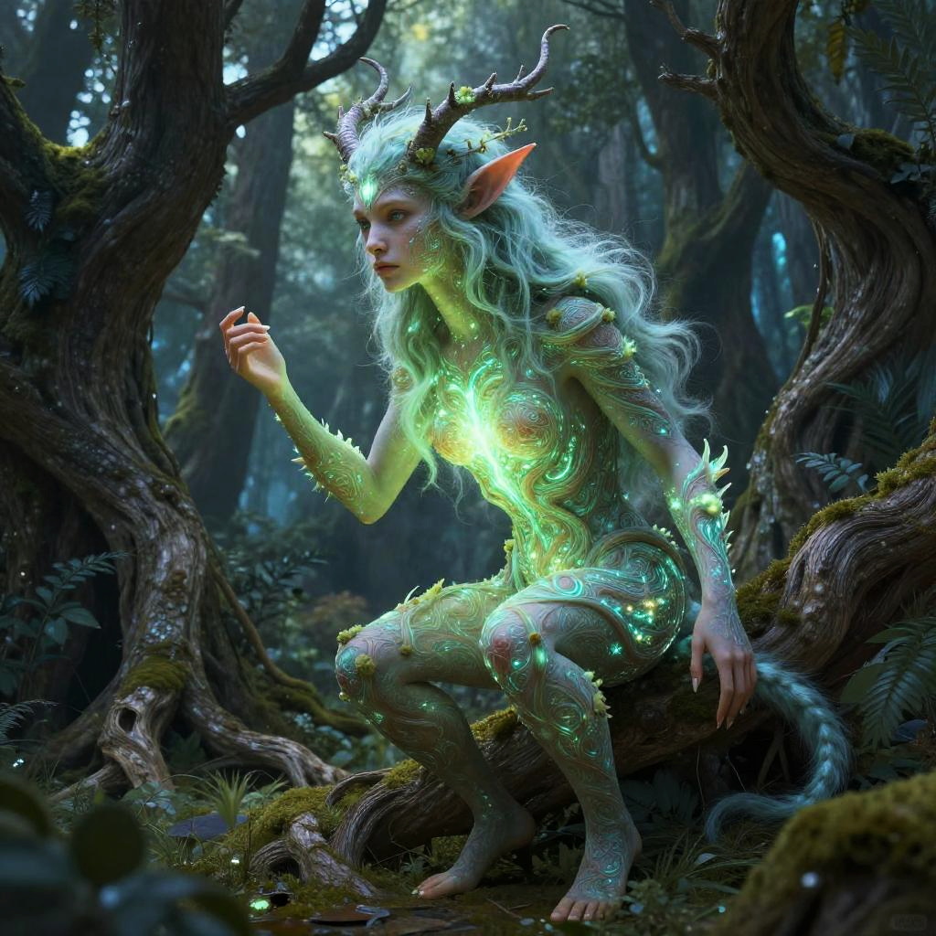 Changeling fantasy art depicting a mystical forest creature transforming between human and fae forms, glowing ethereal light, intricate natural patterns on skin, surrounded by ancient trees with twisting branches, enchanted atmosphere, vivid colors, high detail.
