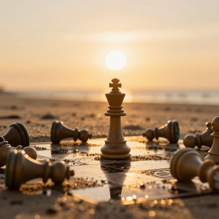 Amidst the golden glow of a setting sun, a solitary chess king stands resolute in a sea of scattered pieces, their reflections shimmering in puddles of sand, symbolizing the transient dance of power and fate in an endless, silent game.