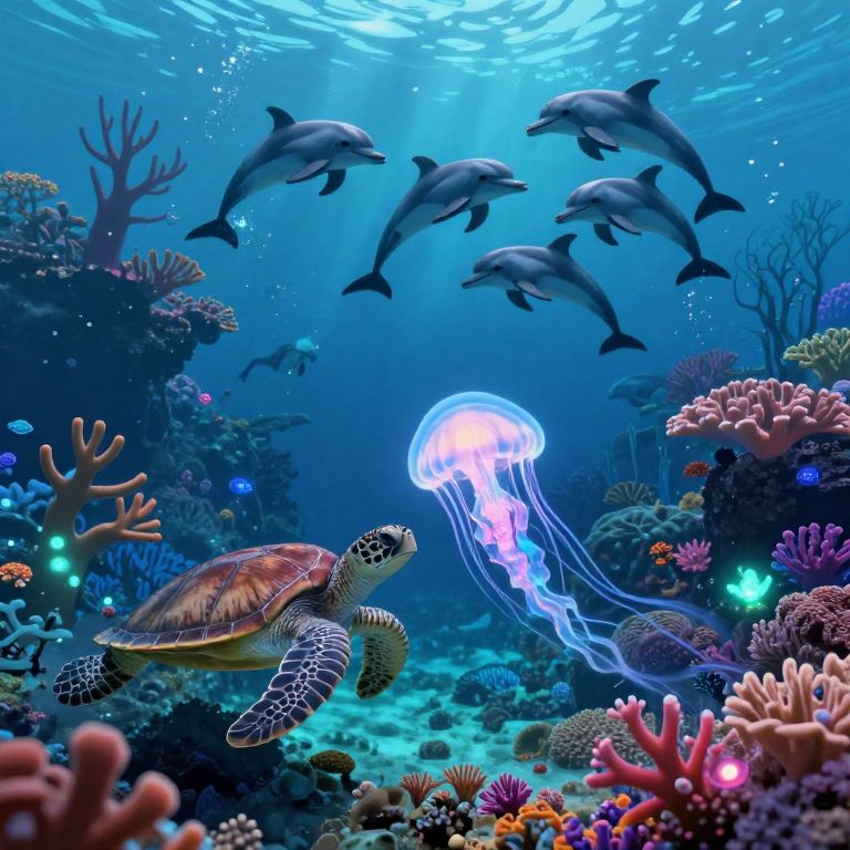 Envision an underwater wonderland reminiscent of Hayao Miyazaki's ethereal realms, where a luminous jellyfish gracefully dances among lush coral reefs bursting with vibrant hues. From the vantage point of a leisurely sea turtle navigating this captivating seascape, witness the enchanting choreography of aquatic life bathed in the soft radiance of glowing flora and fauna. This tranquil ambiance is suddenly enlivened by a lively group of dolphins performing acrobatic feats above the coral formations, their joyful expressions encapsulating the scene's lighthearted charm.