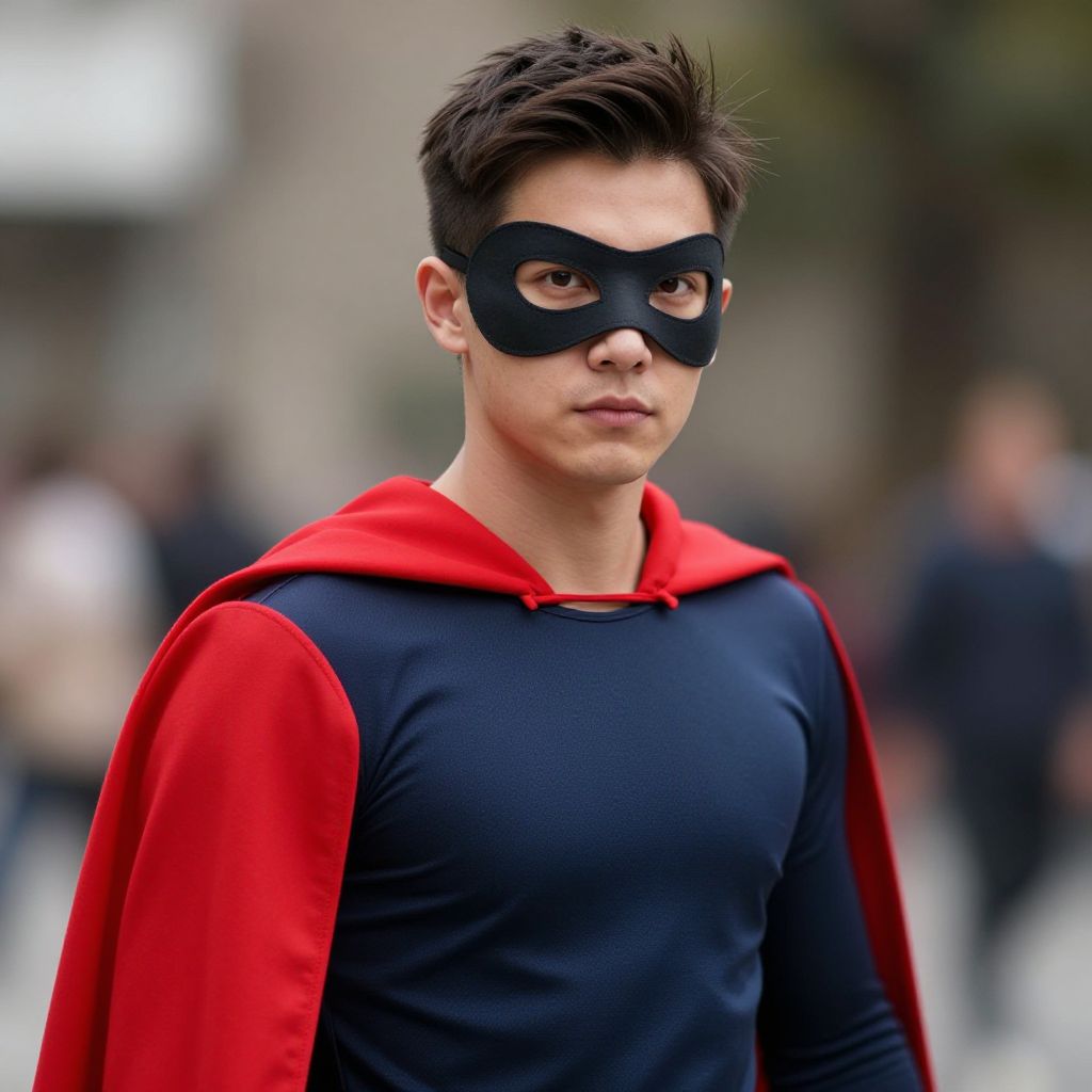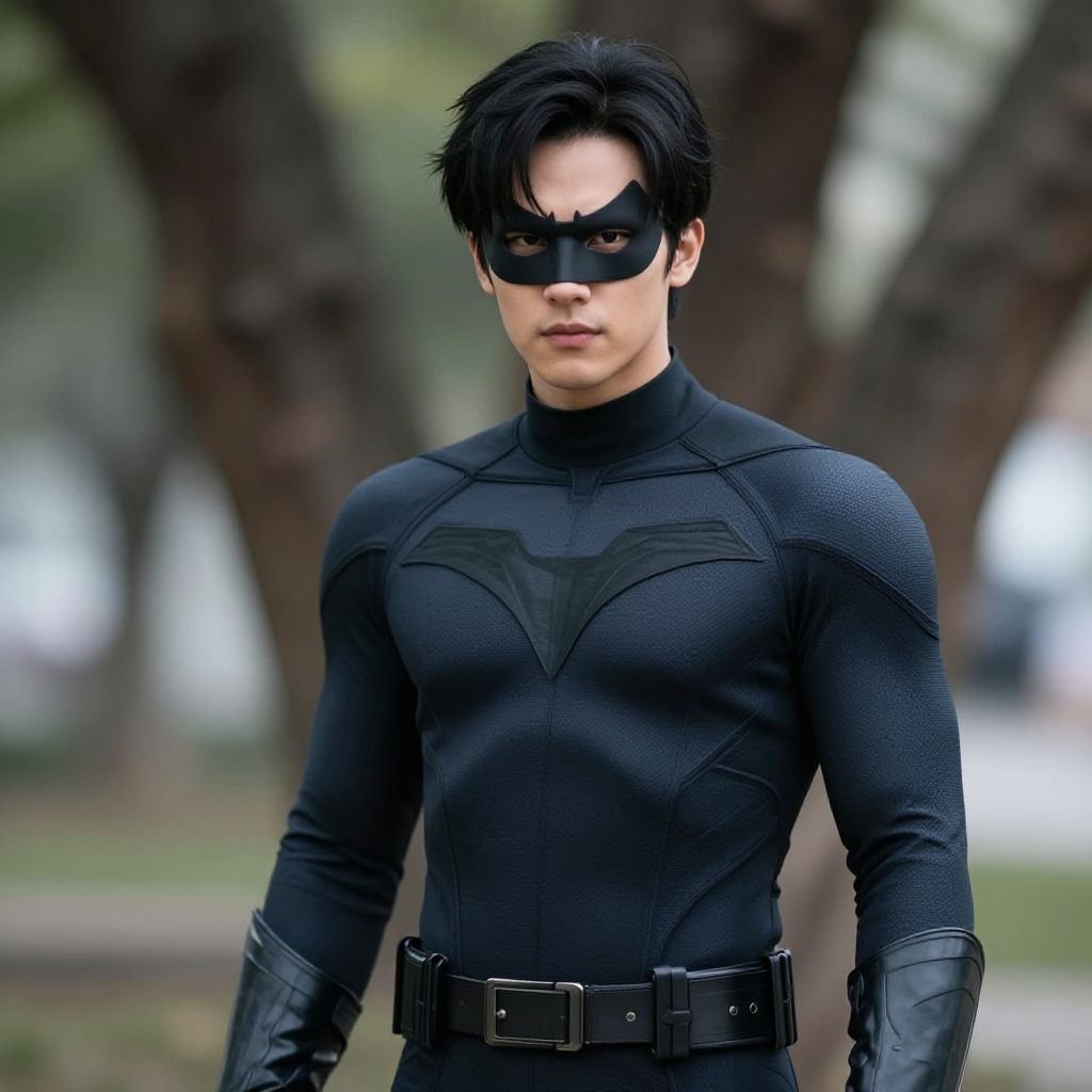 A man in a black superhero costume is standing on a street. He has a black mask on his face and is wearing black gloves.