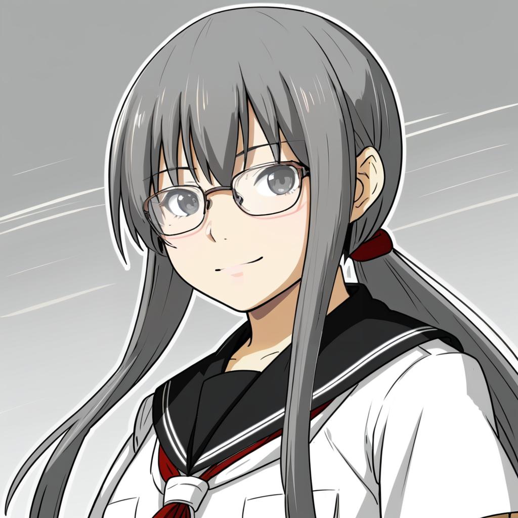 Amagiri (kancolle), kantai collection, 1girl, grey eyes, hair between eyes, glasses, grey hair, very long hair, black hair, ponytail, asymmetrical bangs, serafuku, by artist shiseki hirame, anime