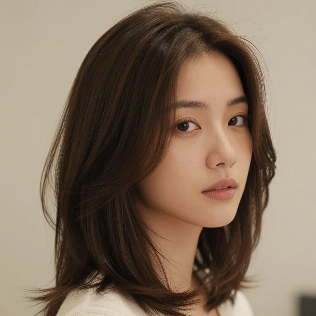 Woman with soft, blunt cut with a side part hairstyle, minimalist and powerful, high-resolution detail, urban café setting, morning light, calm expression, strong yet gentle posture, modern womanhood, simplicity with depth, subtle contrast in hair texture, grounded elegance.