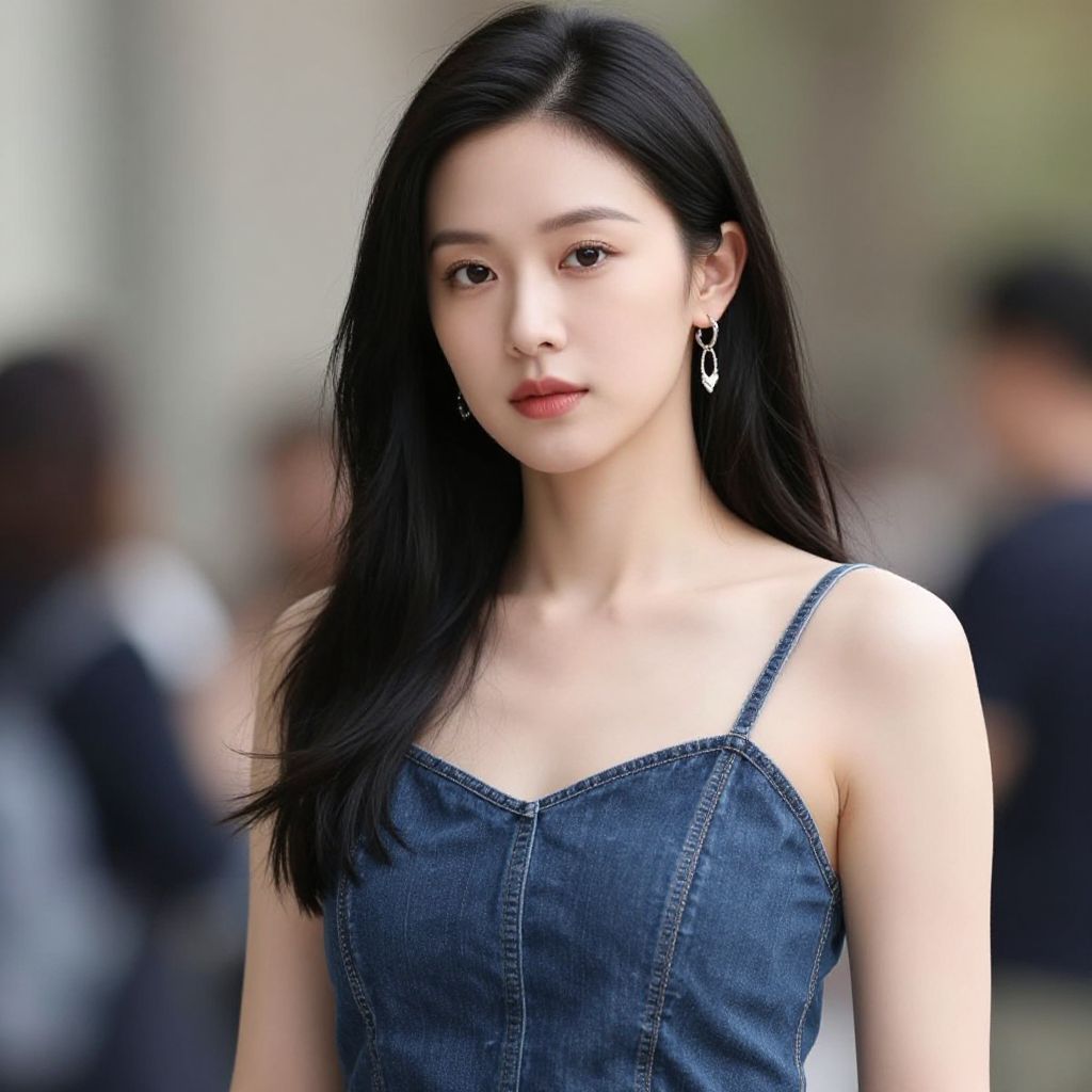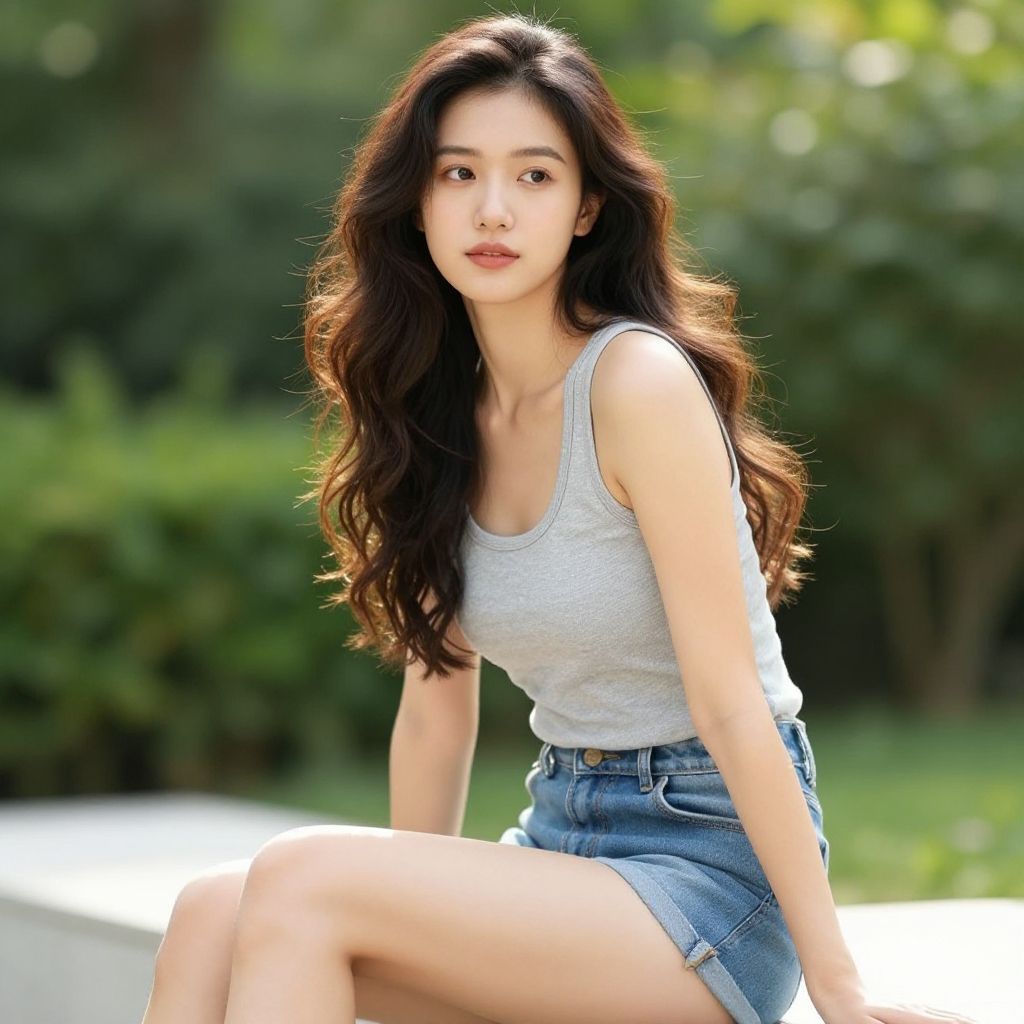 Photograph of a young Asian woman with a sleek, shoulder-length black bob, wearing a black tank top, seated indoors, softly lit, with a