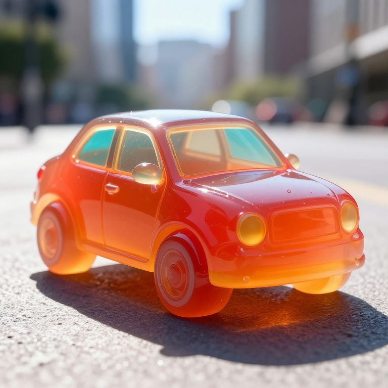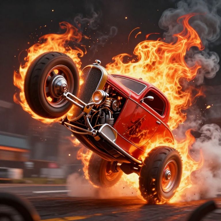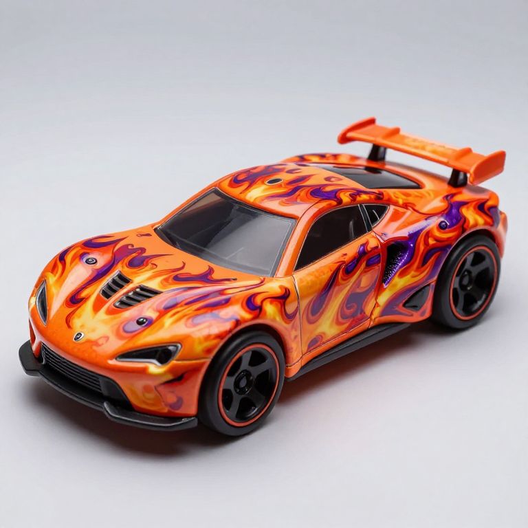 A vibrant, flame-painted RC car defies convention with its fiery orange and purple hues, transforming a miniature vehicle into a living embodiment of speed and rebellion, as if it were born from the very flames it carries.