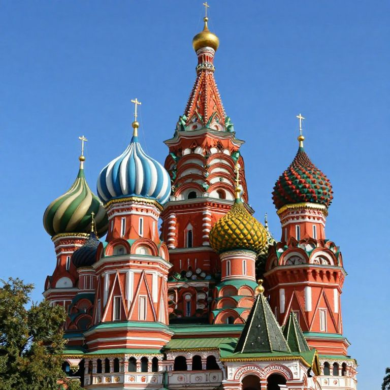St. Basil's Cathedral stands majestically in Moscow, showcasing its vibrant red exterior adorned with nine colorful onion domes, intricate patterns, and golden accents under a clear blue sky.