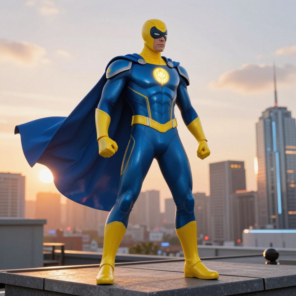 Blue and yellow superhero standing heroically on a rooftop at sunset, cape flowing in the wind, futuristic city skyline in the background, detailed costume armor reflecting light, vibrant and dynamic comic book style, powerful stance with glowing emblem on chest.