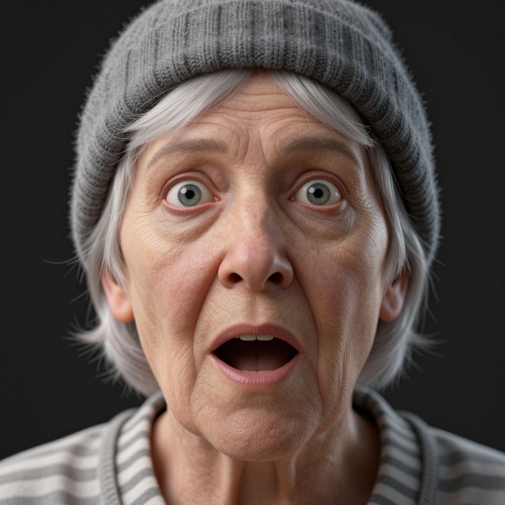 Close-up photograph of an elderly woman with shocked expression, wearing a gray knit beanie and striped shirt, against a black background.