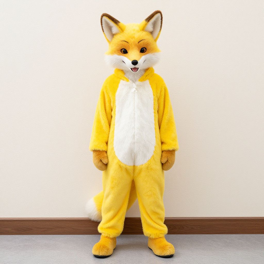 Photograph of a standing, anthropomorphic tiger costume with orange and black stripes, white chest, and black nose, against a plain gray background.