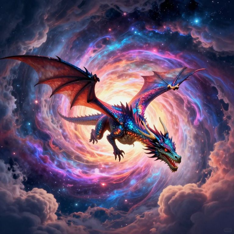 Visualize an enchanting digital realm where Rackham's whimsical illustrations intertwine with Frazetta's intricate worldbuilding, showcasing a magnificent dragon gliding through a mesmerizing vortex of cosmic energy. From an aerial vantage point, behold this awe-inspiring creature as it gracefully navigates the turbulent, vibrant clouds that extend endlessly into infinity, casting dazzling reflections upon its iridescent scales. This scene instills a profound sense of wonder and excitement, capturing both the fantastical essence of their celestial encounter and the primal fear and reverence evoked by the dragon's presence.
