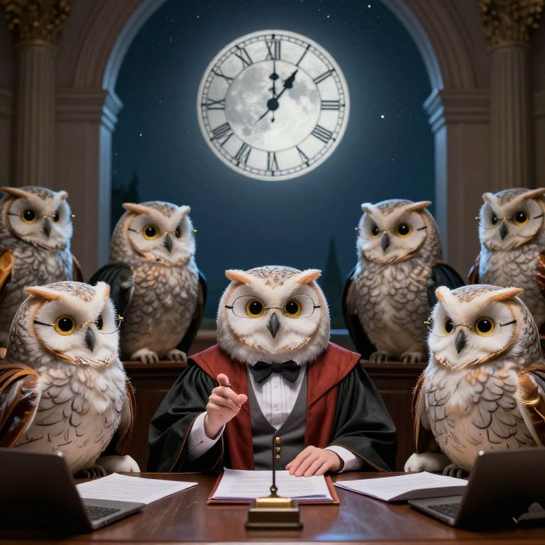 A parliament of owls, wearing tiny glasses and parliamentary robes, debates the ethics of moonlight taxation beneath a clockwork moon.