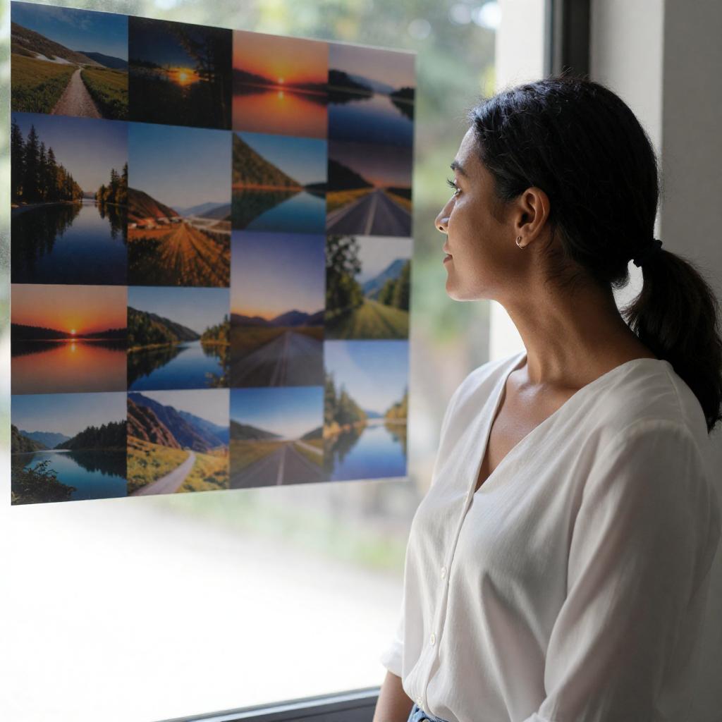 Profile view of a woman with dark skin and black hair tied in a ponytail, wearing a white blouse, standing indoors by a window. She is gazing at a colorful collage of overlapping landscape photographs attached to the window. Bright natural light filters through, highlighting her contemplative expression and the vivid images of nature outside.