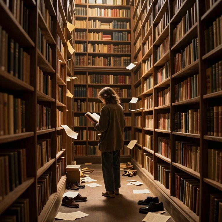 In an ancient library bathed in golden light, a solitary figure stands amidst rows of towering bookshelves, where the air seems charged with whispers from the pages, while scattered papers and shoes on the floor hint at a magical, chaotic encounter between reader and text.