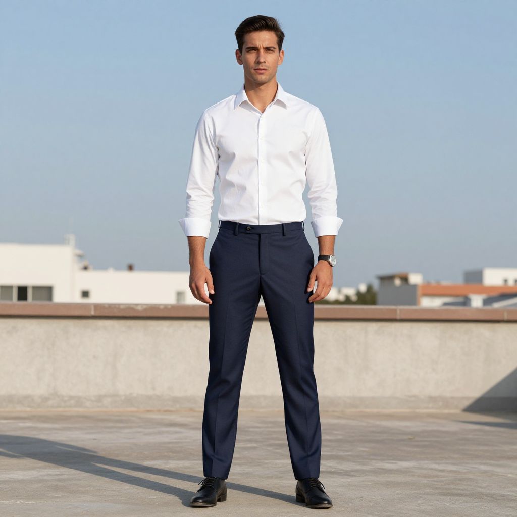 Photograph of a young man standing on a rooftop, wearing a white button-up shirt, dark navy pants, black shoes, and a wristwatch,