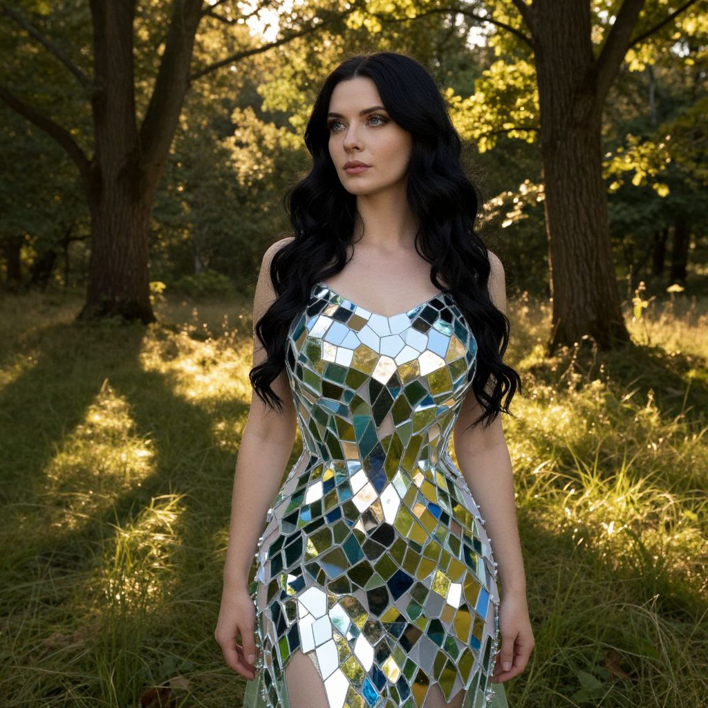A fantasy-style outdoor scene of a woman with long, wavy black hair and serene blue eyes standing at the edge of a forest clearing during golden hour. Her Mirror Shard Dress catches the sunlight like a living mosaic of shattered mirrors, each fragment reflecting different parts of the sky and trees. The light refracts in intricate patterns across the grass, creating a dynamic contrast between the soft natural world and the high-tech, reflective dress.. The woman has big tits and cute face
