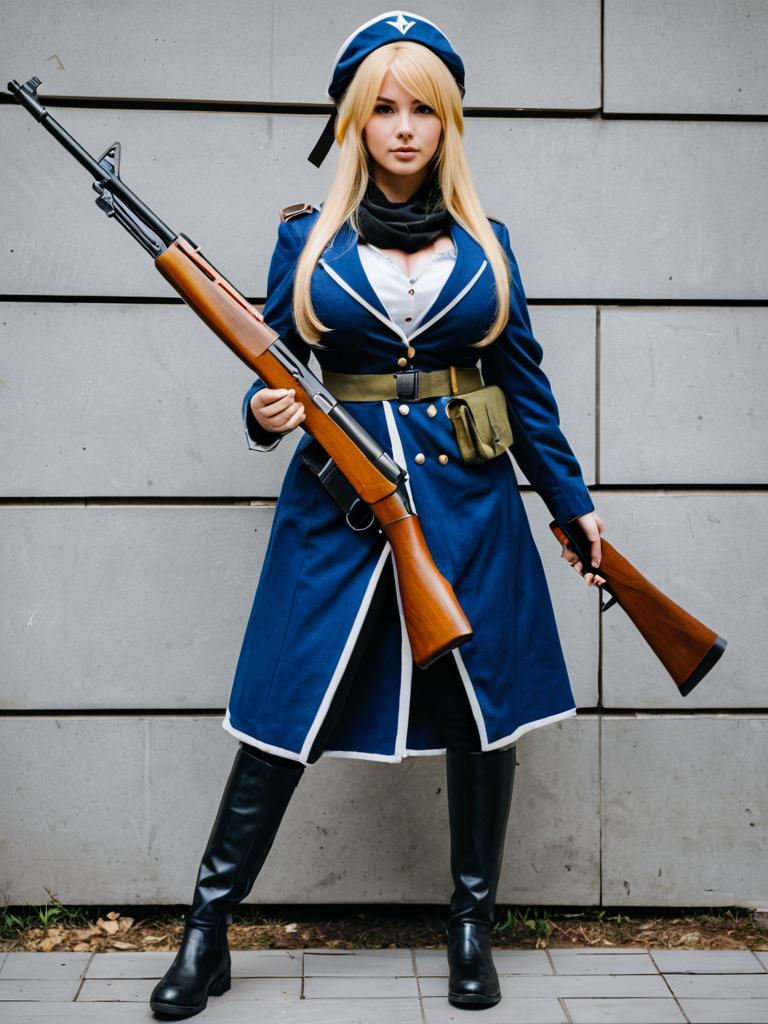 Photo-realistic cosplay photo of person in mosin-nagant (girls' frontline) costume. Full body. Standing. Full length. 1girl, blue eyes, hair between eyes, blonde hair, long hair, large breasts, medium breasts, mosin-nagant, ushanka