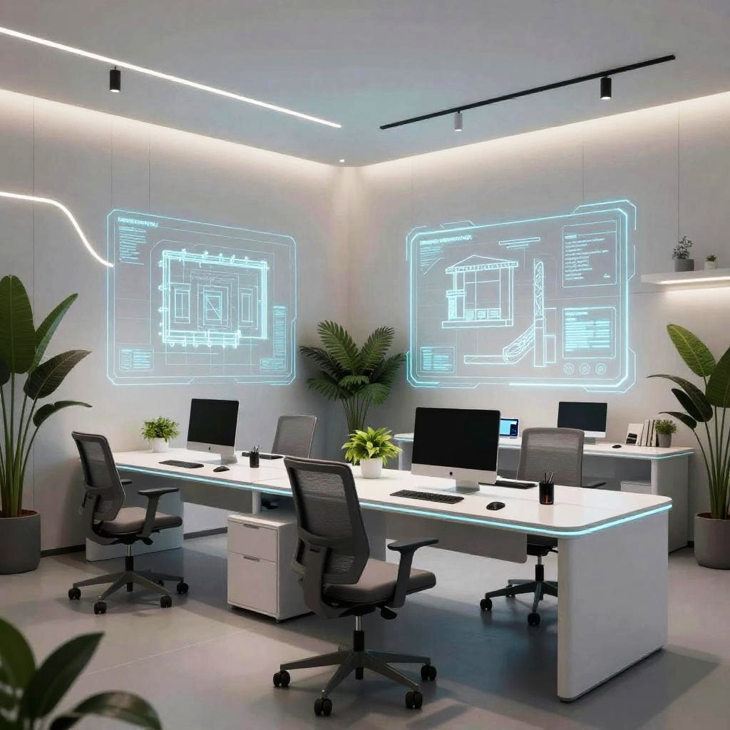 Free room design AI generating custom living space, futuristic workspace with modular desks, ergonomic chairs, neon accent lighting, sleek surfaces, greenery for natural touch, glowing holograms showing design options, virtual assistant helping optimize layout for comfort and style