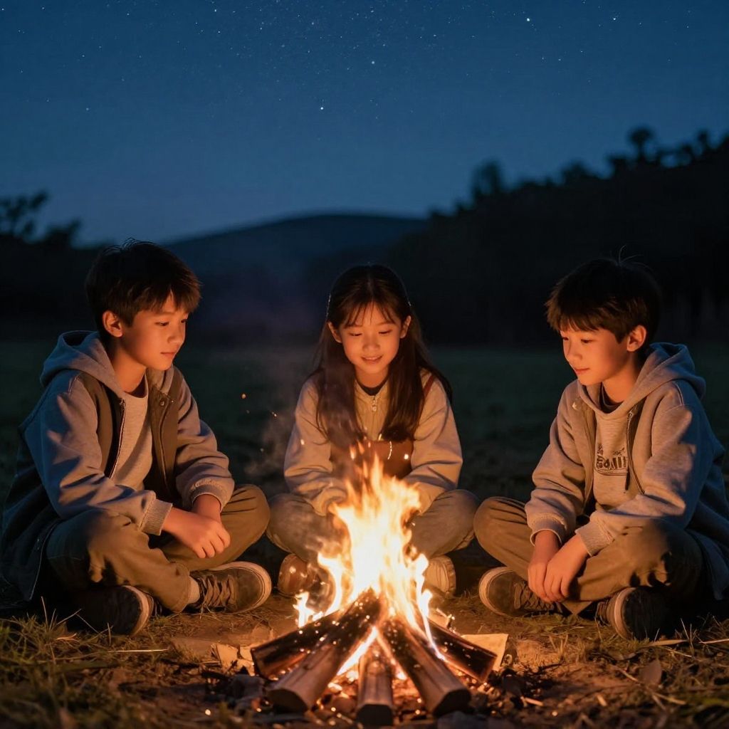 Three boys and one girl sitting around a campfire at dusk, cozy lighting, detailed textures on clothes and faces, starry sky, nature-inspired scene