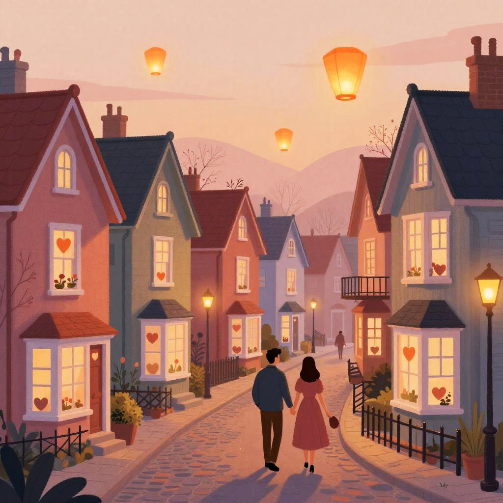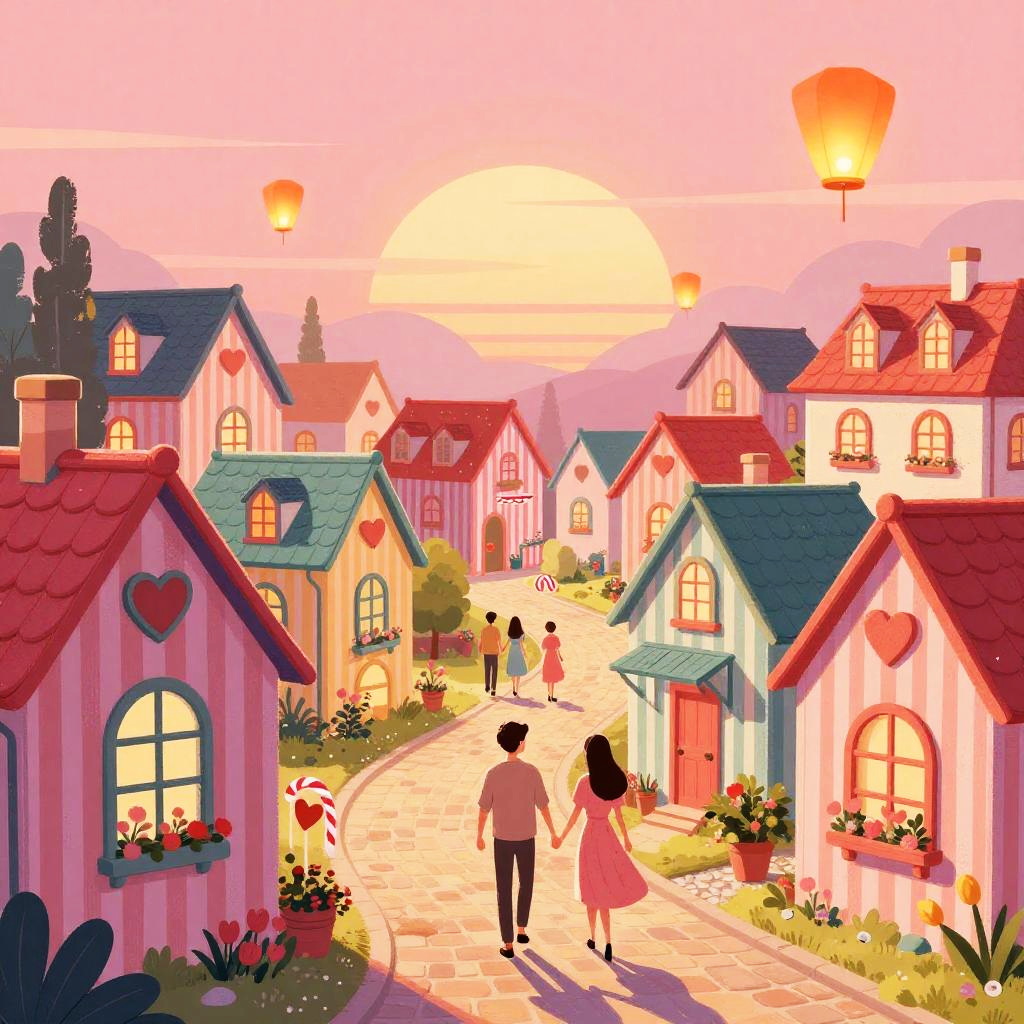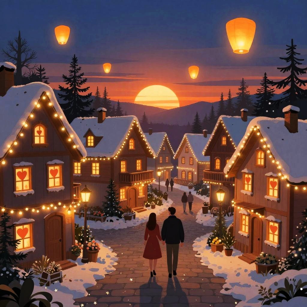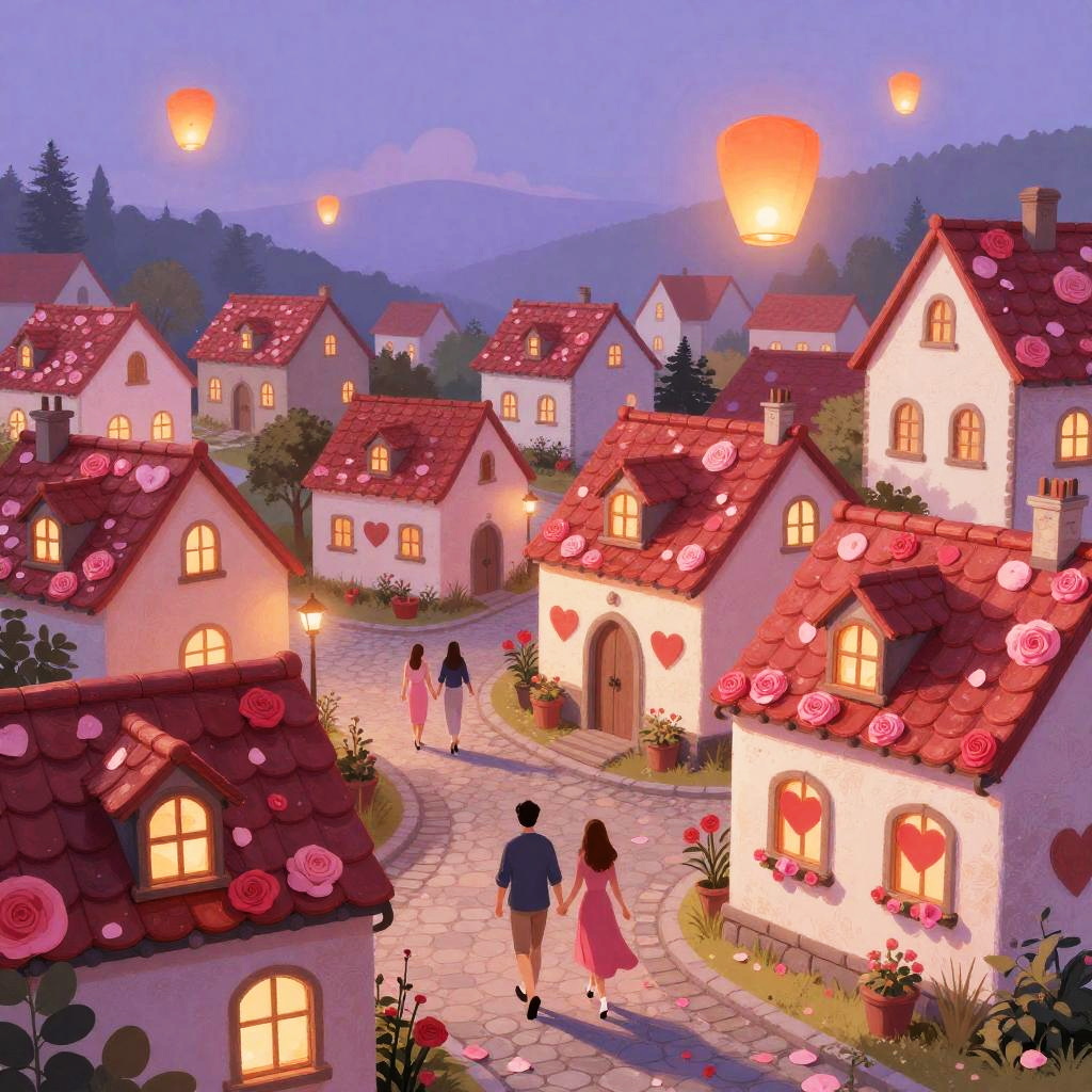 Illustration of a vibrant Valentine’s Day village, with twinkling fairy light-adorned chalets decorated with heart-shaped windows, paved stone paths, couples walking hand-in-hand, and floating lanterns in a glowing embers sunset