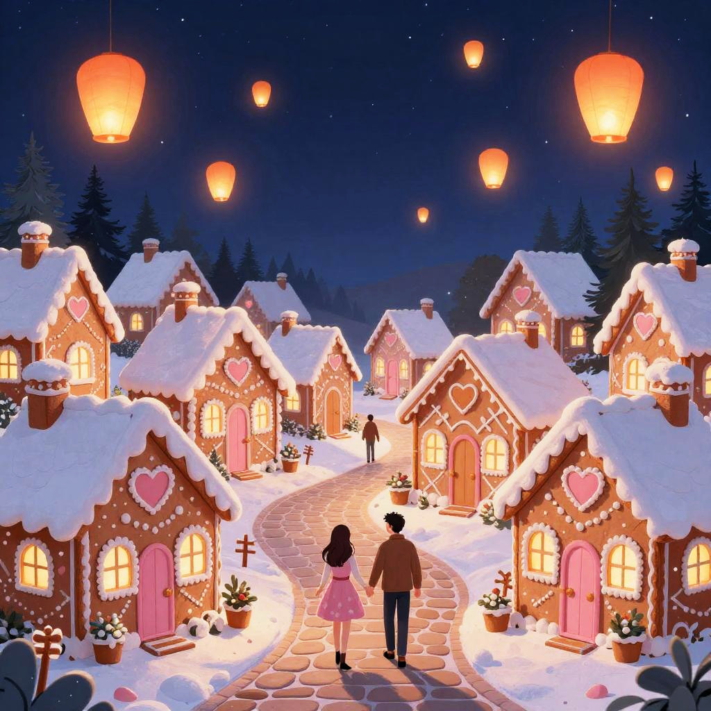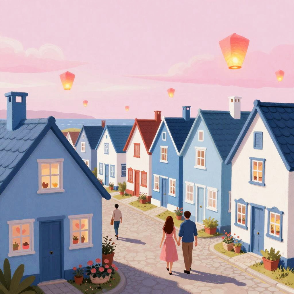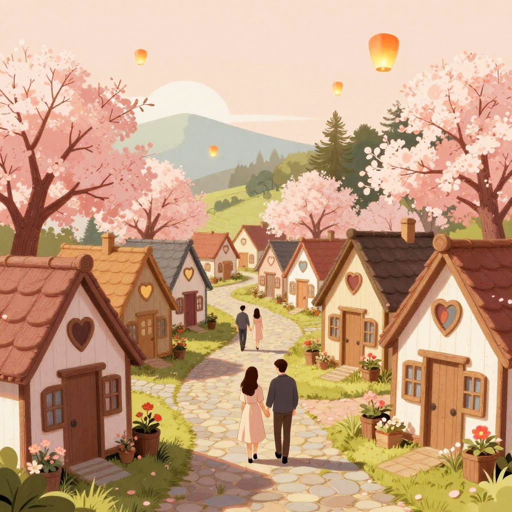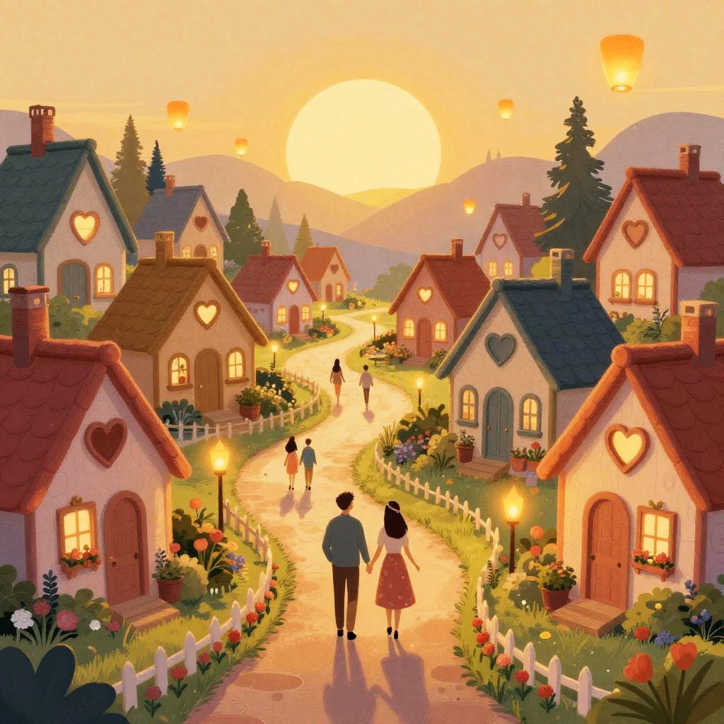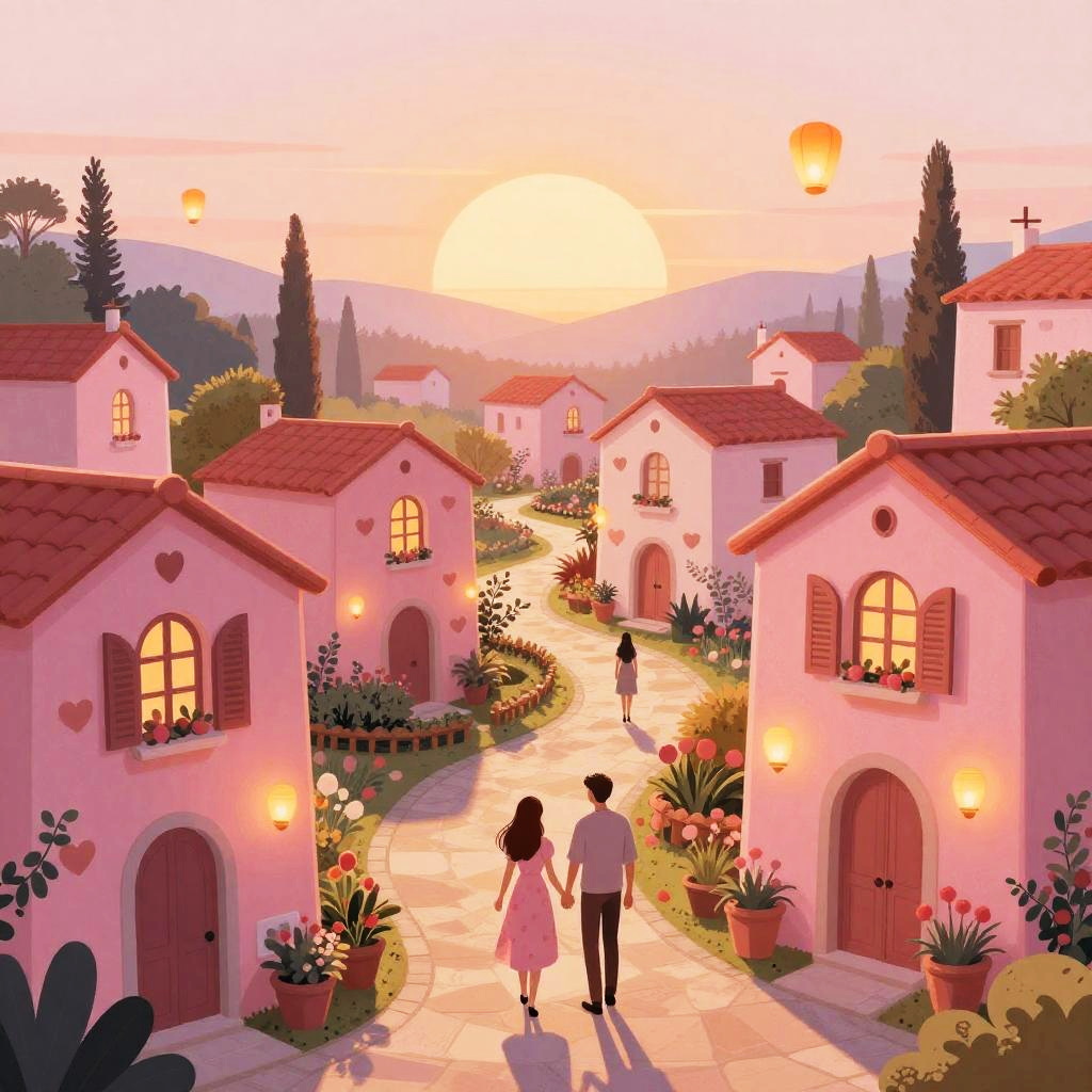 Illustration of a vibrant Valentine’s Day village, with twinkling fairy light-adorned chalets decorated with heart-shaped windows, paved stone paths, couples walking hand-in-hand, and floating lanterns in a glowing embers sunset