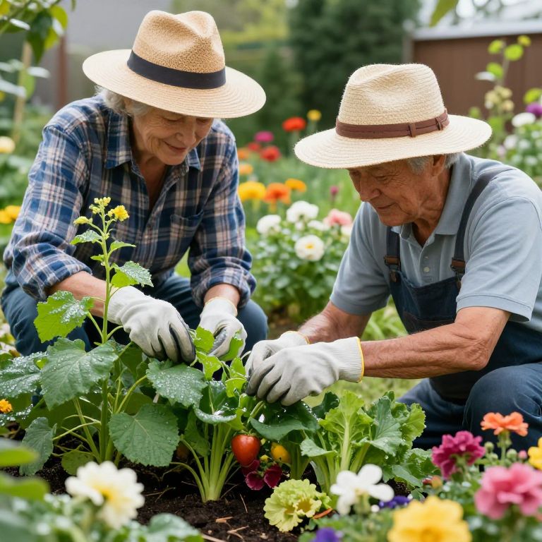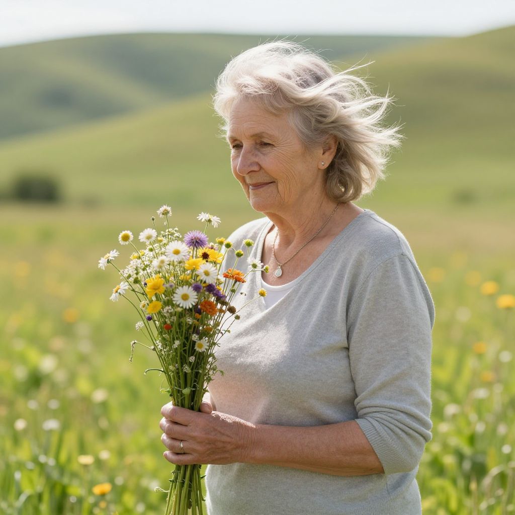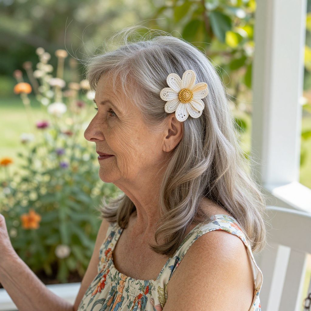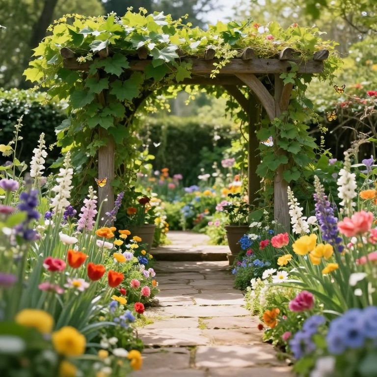A whimsical floral garden archway constructed with red and yellow roses, trailing vines, and handmade wood elements, set in a sunny cottage garden with a white picket fence and daisies in a circular pattern around it, an elderly woman with silver hair and a smile, wearing a sun hat and gardening gloves, gently opens the archway to welcome someone in early spring sunlight.