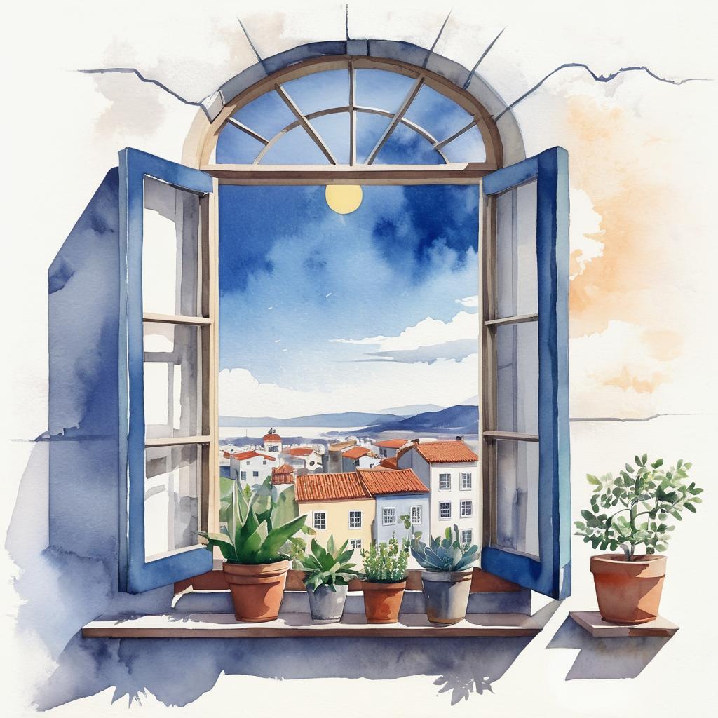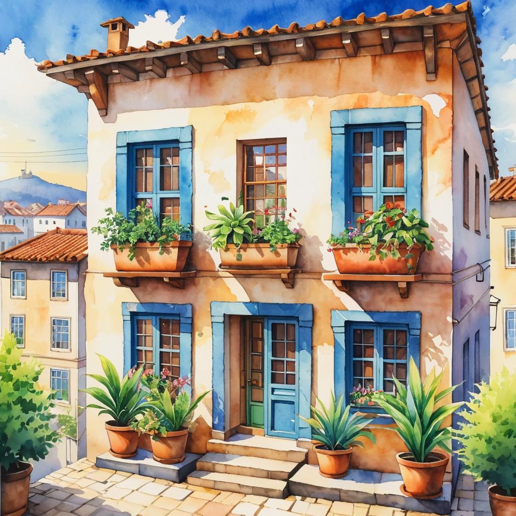 No humans, traditional media, building, painting (medium), house, window, watercolor (medium), scenery, plant, potted plant, outdoors, sun, sky, town, city
