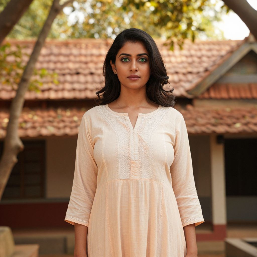 A cinematic lifestyle photo of a contemporary woman with rich black hair and bright green eyes wearing a stylish cotton salwar set in pastel peach and ivory, standing in front of a heritage-style home in a rural Indian village with terracotta rooftops and golden sunlight filtering through trees.. The woman has big tits and cute face