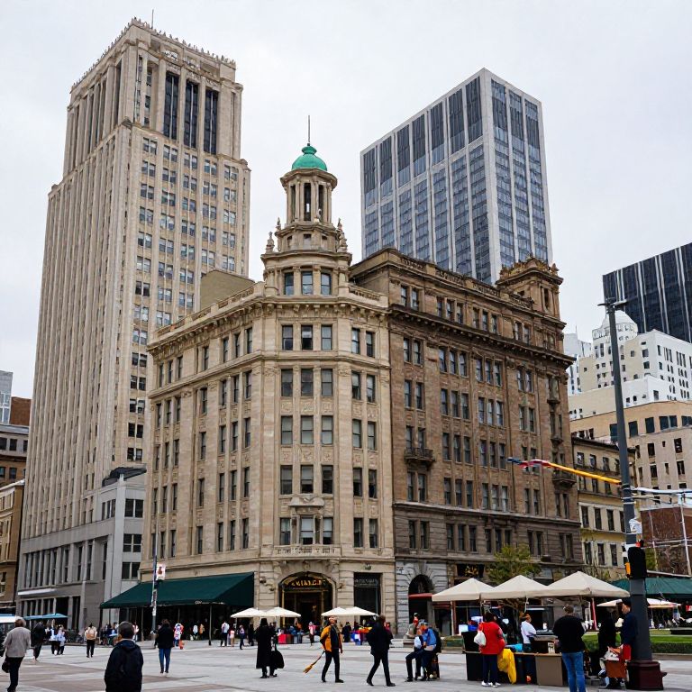 Cityscapes of a metropolitan architecture with a mix of historic and modern buildings, detailed facades and intricate designs, lively street scene with artists and vendors