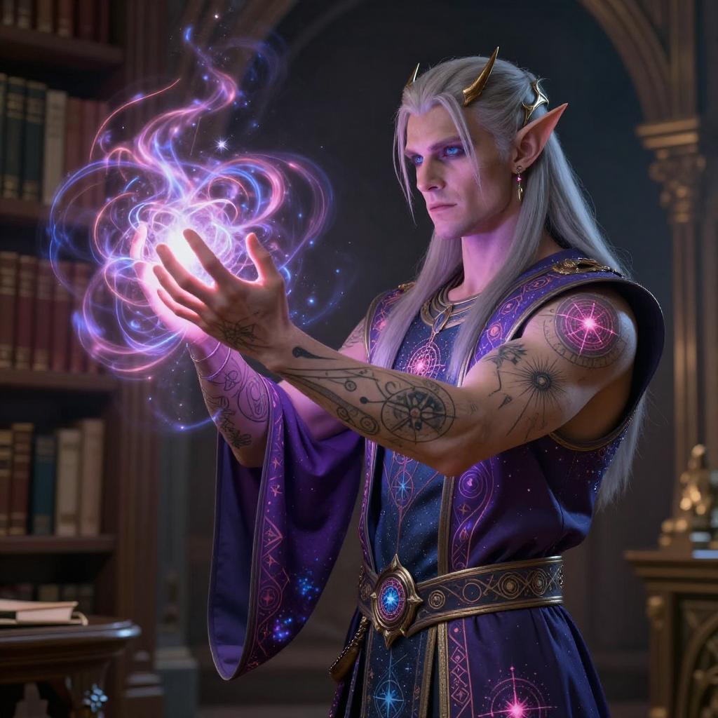 Half elf male mage casting a spell, vibrant magical energy swirling around his outstretched hand, mystical tattoos glowing on his arms, wearing flowing robes with celestial patterns in a dimly lit library