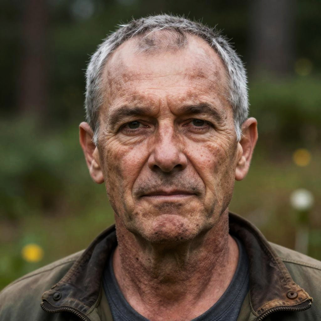 Hyperrealistic portrait of a timeless ruggedness of an older lumberjack, surrounded by the enchanting embrace of nature, skin pores, pores
