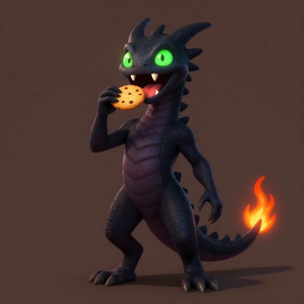 Full body, creature, solo, shadow wyrm, standing, looking at viewer, neon green eyes, holding food, cookie, eating, open mouth, fangs, teeth, flame-tipped tail, claws, smile, happy, blush, tongue, scar, straight-on, brown background