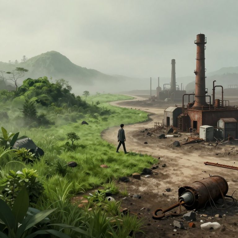 A digital illustration depicts a lone figure walking along a dusty, winding path through a lush, green landscape. To the right, there are two tall, rusted industrial smokestacks and various small, weathered buildings. Scattered debris, including a overturned cylindrical container, lies on the ground near the path. The background features misty hills and more industrial structures in the distance. The sky is overcast, casting a soft light over the scene. The figure is dressed in dark clothing, contrasting with the vibrant greenery and industrial decay. The image combines elements of realism and fantasy, with a focus on the juxtaposition of nature and industry.