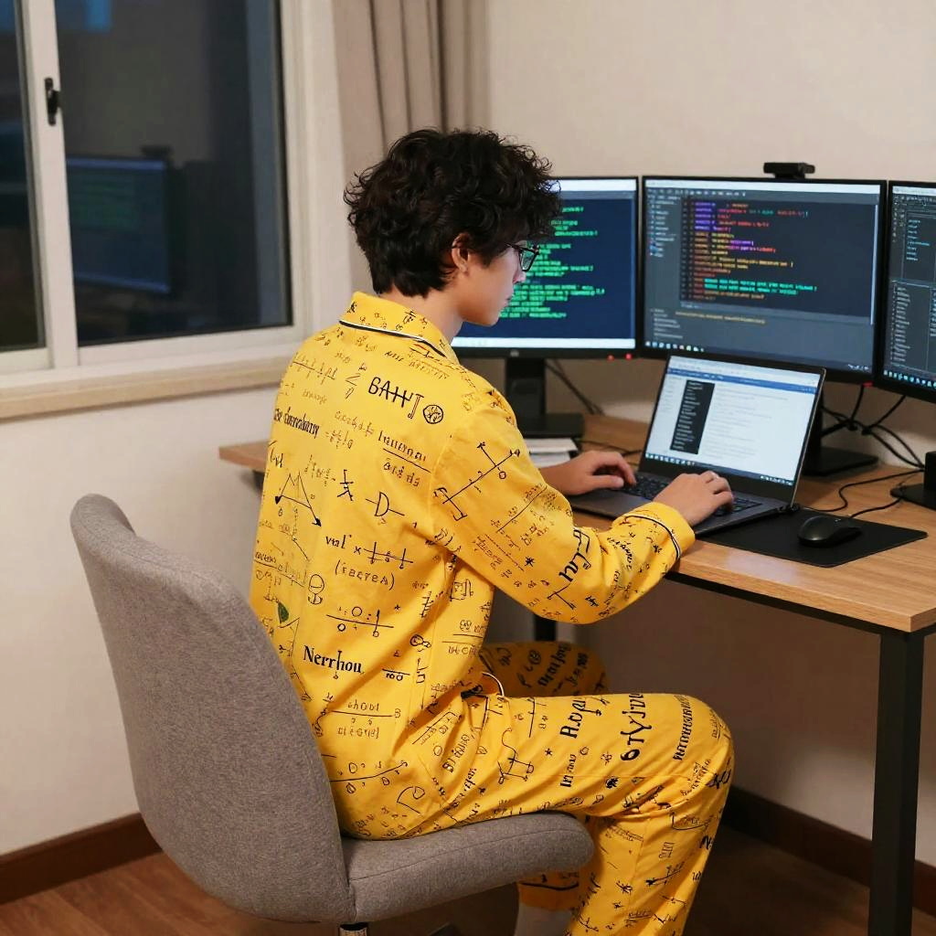 Nerdy pajamas in vibrant colors covered in math equations and computer code, a person sitting at a desk with a laptop and multiple screens, comfy armchair by a window at night